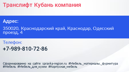 Транслифт Кубань, компания по адресу 350020, Краснодарский край, Краснодар, Одесский проезд, 4 в дальнейшем Организация, размещена в следующих категориях:
