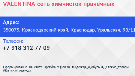 VALENTINA, сеть химчисток-прачечных по адресу 350075, Краснодарский край, Краснодар, Уральская, 98/11 в дальнейшем Организация, размещена в следующих категориях: