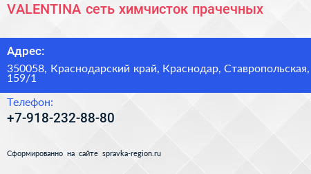 VALENTINA, сеть химчисток-прачечных по адресу 350058, Краснодарский край, Краснодар, Ставропольская, 159/1 в дальнейшем Организация, размещена в следующих категориях: