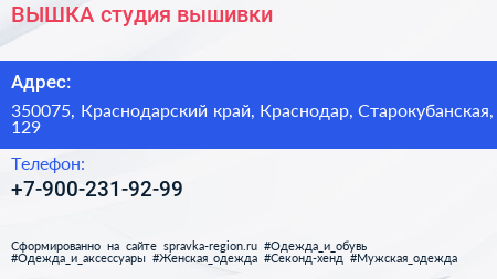 ВЫШКА, студия вышивки по адресу 350075, Краснодарский край, Краснодар, Старокубанская, 129 в дальнейшем Организация, размещена в следующих категориях: