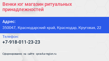 Венки-юг, магазин ритуальных принадлежностей по адресу 350047, Краснодарский край, Краснодар, Круговая, 22 в дальнейшем Организация, размещена в следующих категориях: