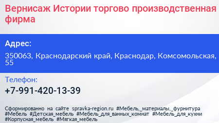 Вернисаж Истории, торгово-производственная фирма по адресу 350063, Краснодарский край, Краснодар, Комсомольская, 55 в дальнейшем Организация, размещена в следующих категориях: