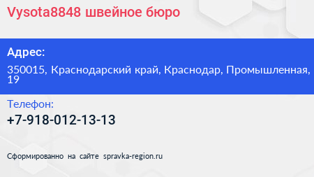 Vysota8848, швейное бюро по адресу 350015, Краснодарский край, Краснодар, Промышленная, 19 в дальнейшем Организация, размещена в следующих категориях: