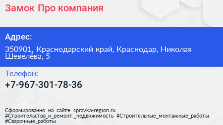 Замок-Про, компания по адресу 350901, Краснодарский край, Краснодар, Николая Шевелёва, 5 в дальнейшем Организация, размещена в следующих категориях: