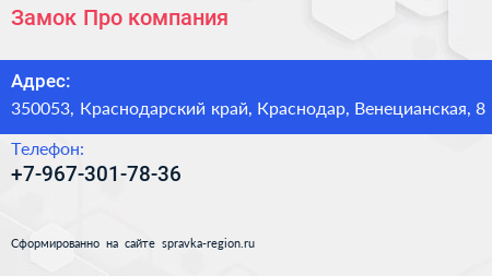Замок-Про, компания по адресу 350053, Краснодарский край, Краснодар, Венецианская, 8 в дальнейшем Организация, размещена в следующих категориях:
