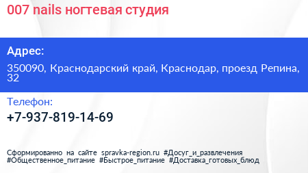 007 nails, ногтевая студия по адресу 350090, Краснодарский край, Краснодар, проезд Репина, 32 в дальнейшем Организация, размещена в следующих категориях: