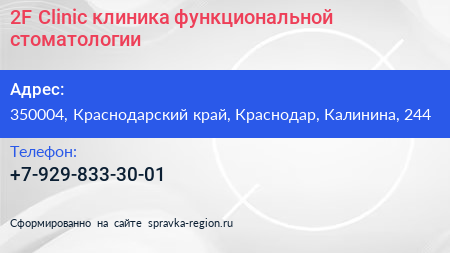 2F Сlinic, клиника функциональной стоматологии по адресу 350004, Краснодарский край, Краснодар, Калинина, 244 в дальнейшем Организация, размещена в следующих категориях: