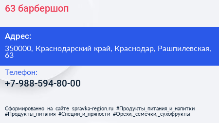 63, барбершоп по адресу 350000, Краснодарский край, Краснодар, Рашпилевская, 63 в дальнейшем Организация, размещена в следующих категориях: