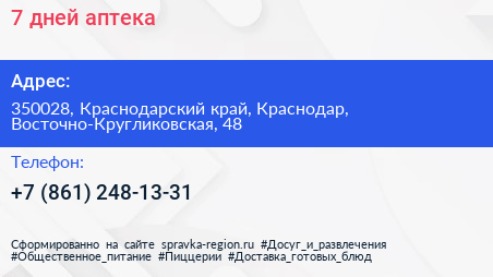7 дней, аптека по адресу 350028, Краснодарский край, Краснодар, Восточно-Кругликовская, 48 в дальнейшем Организация, размещена в следующих категориях: