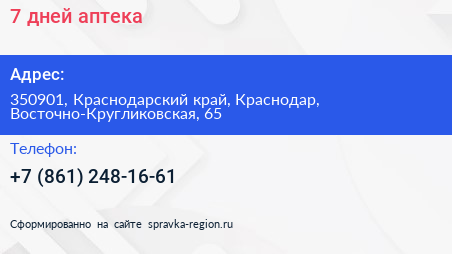 7 дней, аптека по адресу 350901, Краснодарский край, Краснодар, Восточно-Кругликовская, 65 в дальнейшем Организация, размещена в следующих категориях:
