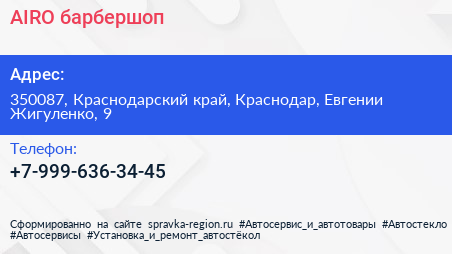 AIRO, барбершоп по адресу 350087, Краснодарский край, Краснодар, Евгении Жигуленко, 9 в дальнейшем Организация, размещена в следующих категориях: