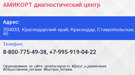 АМИКОРТ, диагностический центр по адресу 350033, Краснодарский край, Краснодар, Ставропольская, 45 в дальнейшем Организация, размещена в следующих категориях: