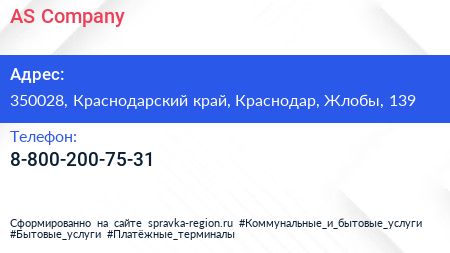 AS Company по адресу 350028, Краснодарский край, Краснодар, Жлобы, 139 в дальнейшем Организация, размещена в следующих категориях: