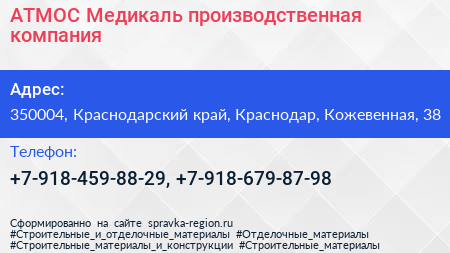 АТМОС Медикаль, производственная компания по адресу 350004, Краснодарский край, Краснодар, Кожевенная, 38 в дальнейшем Организация, размещена в следующих категориях: