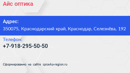 Айс, оптика по адресу 350075, Краснодарский край, Краснодар, Селезнёва, 192 в дальнейшем Организация, размещена в следующих категориях:
