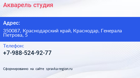 Акварель, студия по адресу 350087, Краснодарский край, Краснодар, Генерала Петрова, 5 в дальнейшем Организация, размещена в следующих категориях: