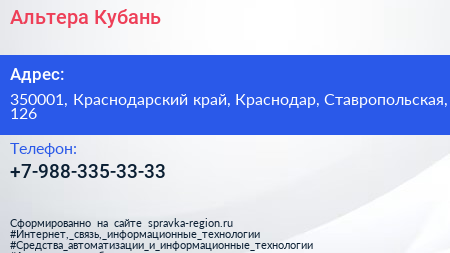 Альтера-Кубань по адресу 350001, Краснодарский край, Краснодар, Ставропольская, 126 в дальнейшем Организация, размещена в следующих категориях: