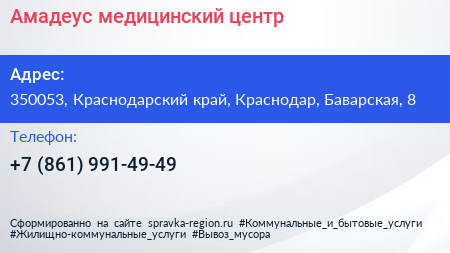 Амадеус, медицинский центр по адресу 350053, Краснодарский край, Краснодар, Баварская, 8 в дальнейшем Организация, размещена в следующих категориях: