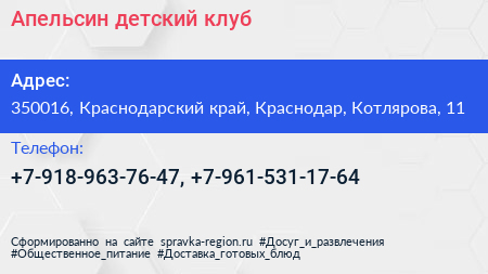 Апельсин, детский клуб по адресу 350016, Краснодарский край, Краснодар, Котлярова, 11 в дальнейшем Организация, размещена в следующих категориях:
