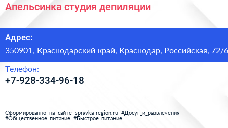 Апельсинка, студия депиляции по адресу 350901, Краснодарский край, Краснодар, Российская, 72/6 в дальнейшем Организация, размещена в следующих категориях: