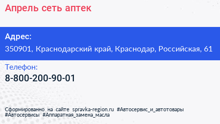 Апрель, сеть аптек по адресу 350901, Краснодарский край, Краснодар, Российская, 61 в дальнейшем Организация, размещена в следующих категориях: