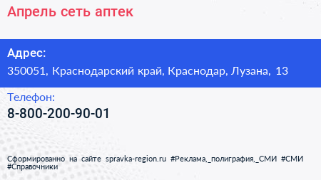 Апрель, сеть аптек по адресу 350051, Краснодарский край, Краснодар, Лузана, 13 в дальнейшем Организация, размещена в следующих категориях: