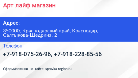 Арт лайф, магазин по адресу 350000, Краснодарский край, Краснодар, Салтыкова-Щедрина, 2 в дальнейшем Организация, размещена в следующих категориях: