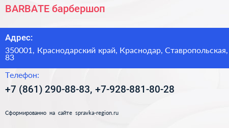 BARBATE, барбершоп по адресу 350001, Краснодарский край, Краснодар, Ставропольская, 83 в дальнейшем Организация, размещена в следующих категориях: