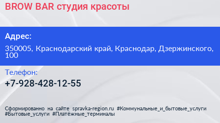 BROW BAR, студия красоты по адресу 350005, Краснодарский край, Краснодар, Дзержинского, 100 в дальнейшем Организация, размещена в следующих категориях: