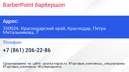 BarberPoint, барбершоп по адресу 350024, Краснодарский край, Краснодар, Петра Метальникова, 7 в дальнейшем Организация, размещена в следующих категориях: