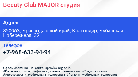 Beauty Club MAJOR, студия по адресу 350063, Краснодарский край, Краснодар, Кубанская Набережная, 39 в дальнейшем Организация, размещена в следующих категориях: