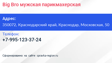 Big Bro, мужская парикмахерская по адресу 350072, Краснодарский край, Краснодар, Московская, 50 в дальнейшем Организация, размещена в следующих категориях: