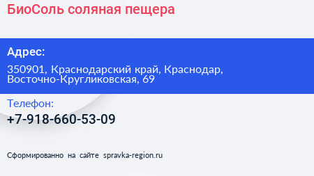 БиоСоль, соляная пещера по адресу 350901, Краснодарский край, Краснодар, Восточно-Кругликовская, 69 в дальнейшем Организация, размещена в следующих категориях: