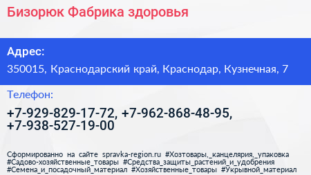 Бизорюк-Фабрика здоровья по адресу 350015, Краснодарский край, Краснодар, Кузнечная, 7 в дальнейшем Организация, размещена в следующих категориях: