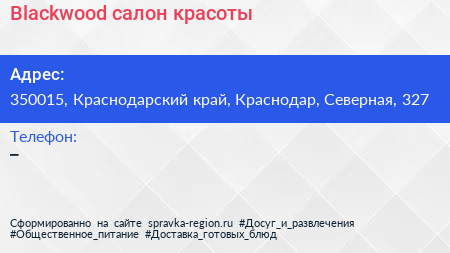 Blackwood, салон красоты по адресу 350015, Краснодарский край, Краснодар, Северная, 327 в дальнейшем Организация, размещена в следующих категориях: