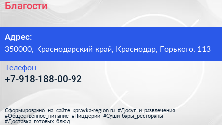 Благости по адресу 350000, Краснодарский край, Краснодар, Горького, 113 в дальнейшем Организация, размещена в следующих категориях: