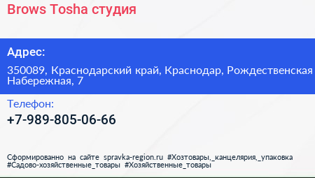 Brows & Tosha, студия по адресу 350089, Краснодарский край, Краснодар, Рождественская Набережная, 7 в дальнейшем Организация, размещена в следующих категориях: