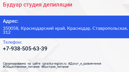 Будуар, студия депиляции по адресу 350058, Краснодарский край, Краснодар, Ставропольская, 312 в дальнейшем Организация, размещена в следующих категориях: