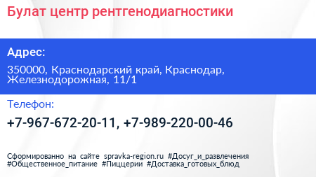 Булат, центр рентгенодиагностики по адресу 350000, Краснодарский край, Краснодар, Железнодорожная, 11/1 в дальнейшем Организация, размещена в следующих категориях: