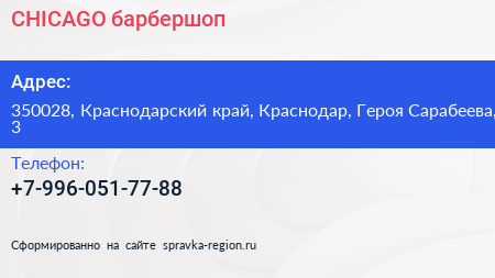 CHICAGO, барбершоп по адресу 350028, Краснодарский край, Краснодар, Героя Сарабеева, 3 в дальнейшем Организация, размещена в следующих категориях: