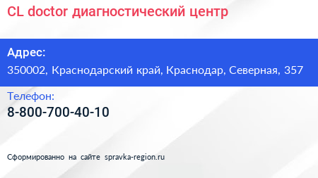 CL doctor, диагностический центр по адресу 350002, Краснодарский край, Краснодар, Северная, 357 в дальнейшем Организация, размещена в следующих категориях: