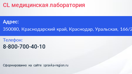 CL, медицинская лаборатория по адресу 350080, Краснодарский край, Краснодар, Уральская, 166/2 в дальнейшем Организация, размещена в следующих категориях: