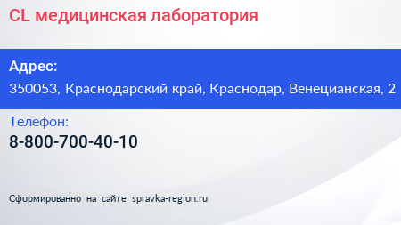 CL, медицинская лаборатория по адресу 350053, Краснодарский край, Краснодар, Венецианская, 2 в дальнейшем Организация, размещена в следующих категориях: