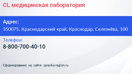 CL, медицинская лаборатория по адресу 350075, Краснодарский край, Краснодар, Селезнёва, 100 в дальнейшем Организация, размещена в следующих категориях: