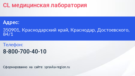 CL, медицинская лаборатория по адресу 350901, Краснодарский край, Краснодар, Достоевского, 84/1 в дальнейшем Организация, размещена в следующих категориях:
