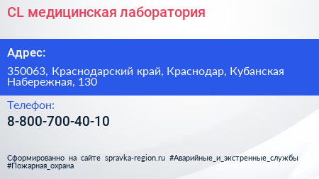 CL, медицинская лаборатория по адресу 350063, Краснодарский край, Краснодар, Кубанская Набережная, 130 в дальнейшем Организация, размещена в следующих категориях: