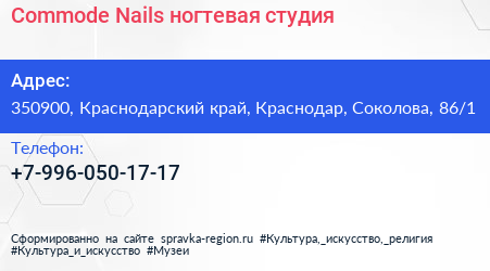 Commode Nails, ногтевая студия по адресу 350900, Краснодарский край, Краснодар, Соколова, 86/1 в дальнейшем Организация, размещена в следующих категориях: