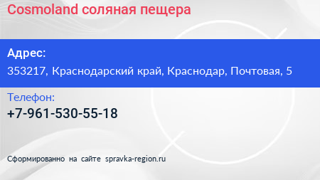 Cosmoland, соляная пещера по адресу 353217, Краснодарский край, Краснодар, Почтовая, 5 в дальнейшем Организация, размещена в следующих категориях: