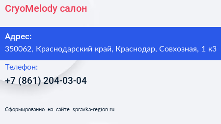 CryoMelody, салон по адресу 350062, Краснодарский край, Краснодар, Совхозная, 1 к3 в дальнейшем Организация, размещена в следующих категориях: