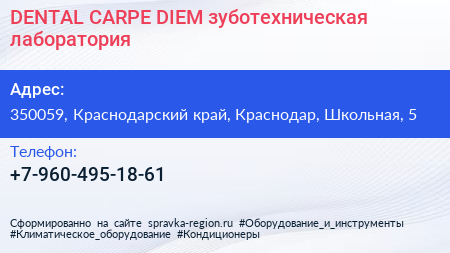 DENTAL CARPE DIEM, зуботехническая лаборатория по адресу 350059, Краснодарский край, Краснодар, Школьная, 5 в дальнейшем Организация, размещена в следующих категориях: